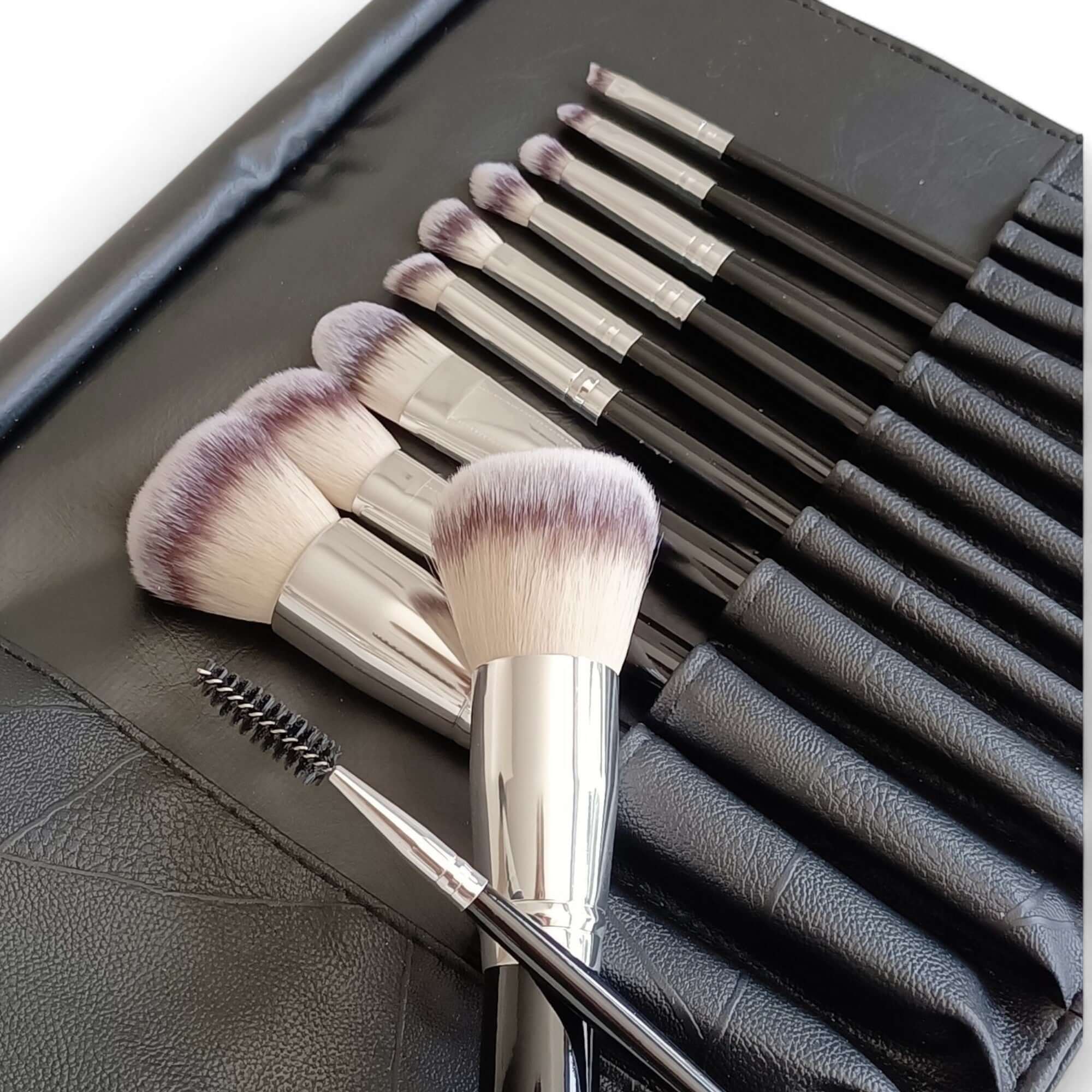 In de set ontvang je 11 hoogwaardige make-upkwasten voor gezicht, ogen en wenkbrauwen. Alles opgeborgen in een stijlvolle, zwarte hoes: praktisch voor thuis én ideaal om mee te nemen.